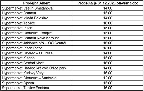 Všechny obchody Albert zůstanou otevřené až do Vánoc v běžných otevíracích hodinách. První sváteční změna nastane během Štědrého dne, kdy budou moci zákazníci vstoupit do prodejen do 11:45, aby stihli dokončit nákup do legislativně stanovených 12 hodin. Oba vánoční svátky, tedy 25. i 26. prosince, budou prodejny Albert zavřené. Následující dny, tedy od 27. prosince, si zákazníci nakoupí opět dle běžné otevírací doby. Poslední den letošního roku, na Silvestra, zůstanou prodejny Albert otevřené do 18 hodin a na Nový rok, 1. ledna 2024 zůstanou zavřené. Poprvé v novém roce si pak zákazníci budou moci nakoupit 2. ledna tak, jak jsou zvyklí.